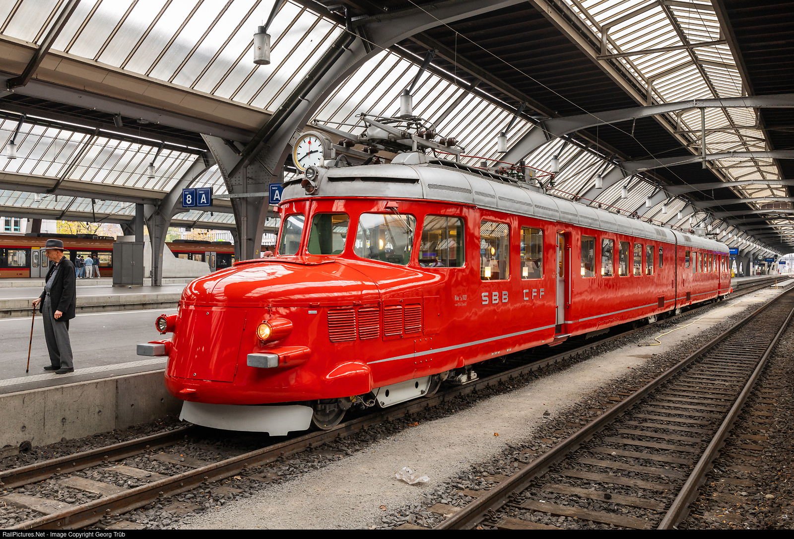 | Double red arrow "Churchill-Pfeil" RAe 4/8 # 1021 of the SBB in Zürich main station. This iconic vehicle was built in 1939 and got the name after WW II, when the english prime minister Sir Winston Churchill visited Switzerland and made some journeys with this railcar. |
