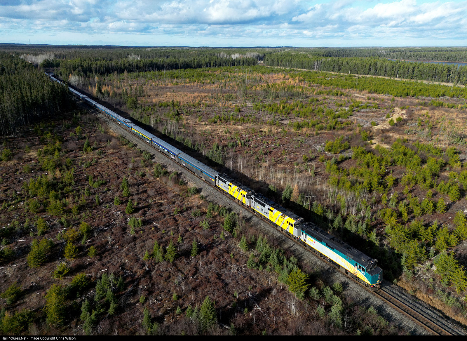 VIA Rail Canada's eastbound train #2, The Canadian heads across Northern Ontario with three F40's and 20 coaches.