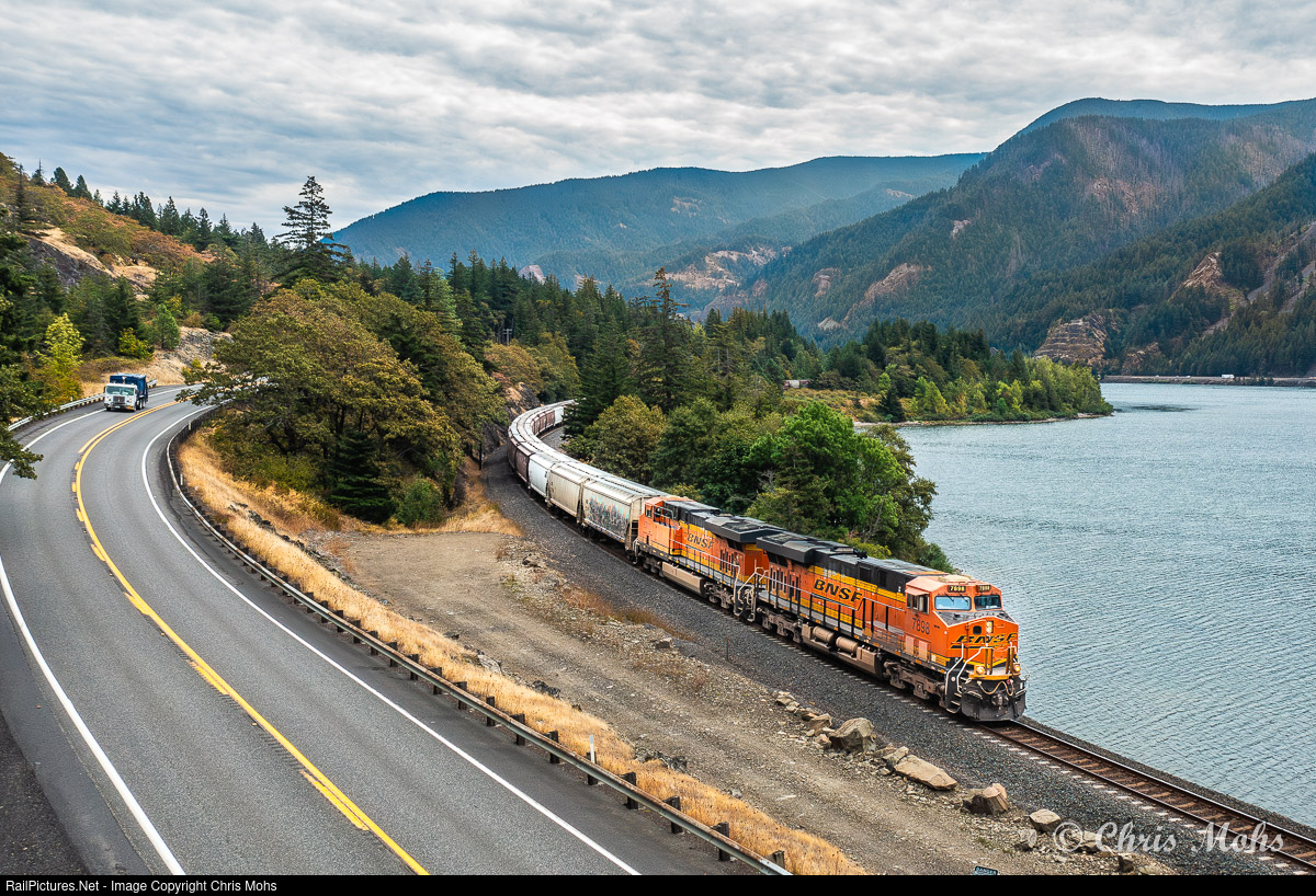 After rounding Collins point on the Columbia River Westbound BNSF ES44DC No. 7898 approaches Wind Mountain with a grain train headed for the ports for shipment.