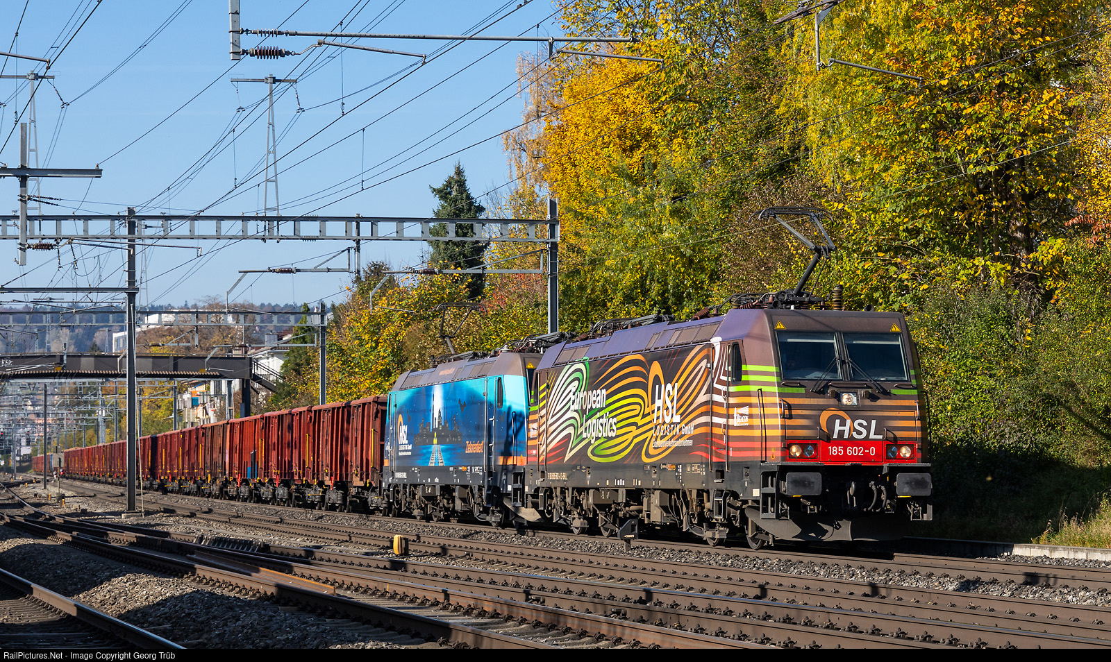 | Bombardier TRAXX F140 MS 185 # 602 and # 601 "Nightrider" of the HSL Logistik, both rented from the Beacon Rail Leasing, pull the about 2550 gross ton sugar beet train 45643 from Wismar/Mecklenburg-Vorpommern/Germany via Basel-Koblenz-Bülach-Winterthur to Islikon (Frauenfeld sugar works), between Winterthur and Oberwinterthur. |
