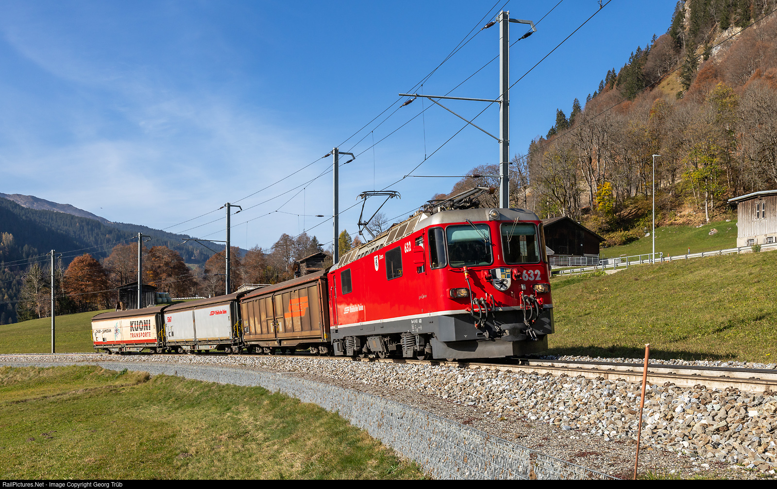 | Construction work on two tunnels on the Albula line has closed the line between Thusis and Preda for two weeks, with buses replacing the trains. Freight trains are being diverted via the Vereina line during this time, as is the Bernina Express. Ge 4/4 II # 632 pulls the diverted freight train 6129 (5129) from Chur freight yard via Landquart-Küblis-Klosters-Vereina tunnel-Zernez to Samedan, between Serneus and Klosters Dorf in the Prättigau. |