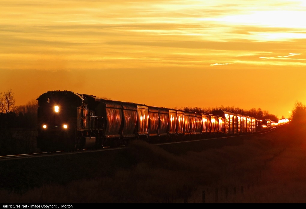 CP 7010 leads a mixed manifest train west just as the sun is rising.