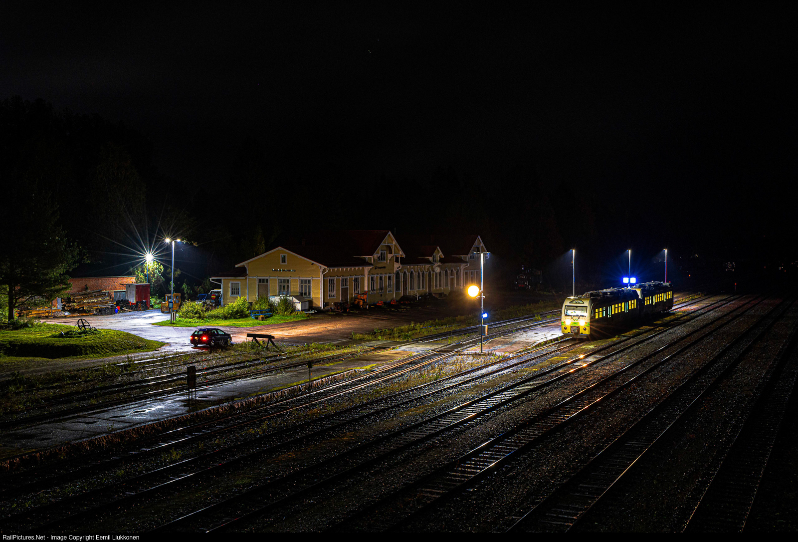 | Friday comes to an end after rainy night. The last train that makes appearance at Haapamäki shines at the station as the two class Dm12s prepare to chance direction to continue their journey from Tampere to Jyväskylä. |