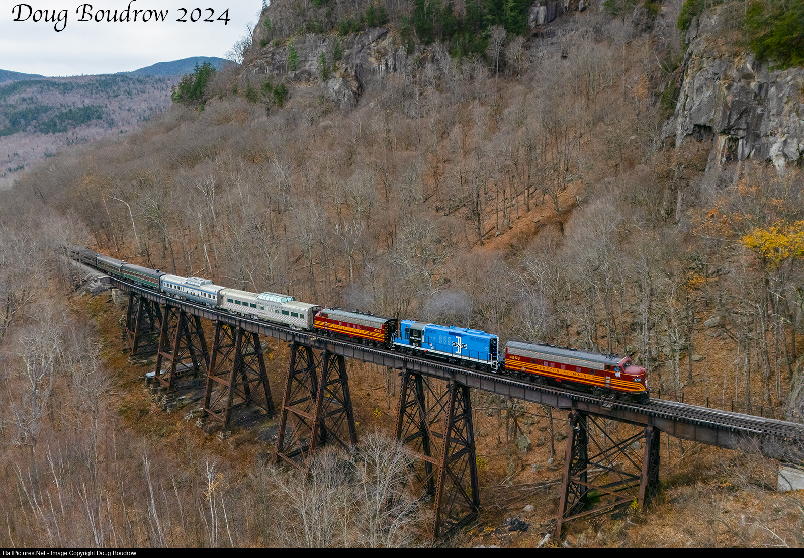 | The 470 Club Special is seen heading West over the 520' long Frankenstein Trestle in Crawford Notch on the former Maine Central Mountain Subdivision, now operated by Conway Scenic Railroad. The 470 Club owns the trio of authentic B&M power, all have been recently restored. The 1741 was finished just weeks before the trip. |
