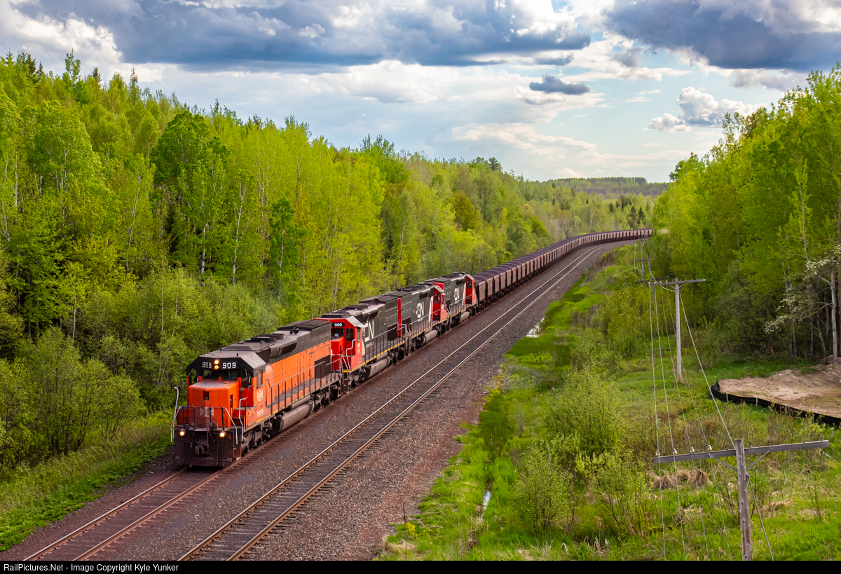 A quartet of EMD tunnel motors lead a loaded CN taconite train bound for Two Harbors