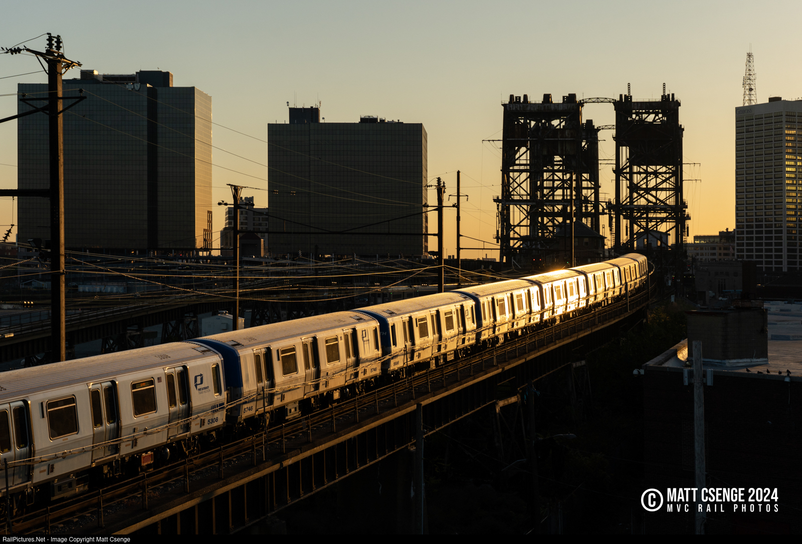 Setting Sunshine. The last rays of the day's sun glint off of the cars of a PATH train as it climbs the approach to Dock Bridge.