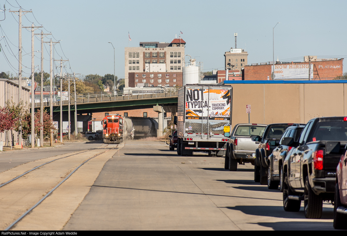 | NOT TYPICAL: Not your typical trucking company meets not your typical railroading. CN's Dubuque based local has just made the shove down the middle of Salina Street. They're in the process of switching Bimbo Bakeries. There isn't an additional track at the bakery for the crew to shuffle cars, so pulling and spotting the bakery requires them to traverse the 1500 foot stretch of street running multiple times. |