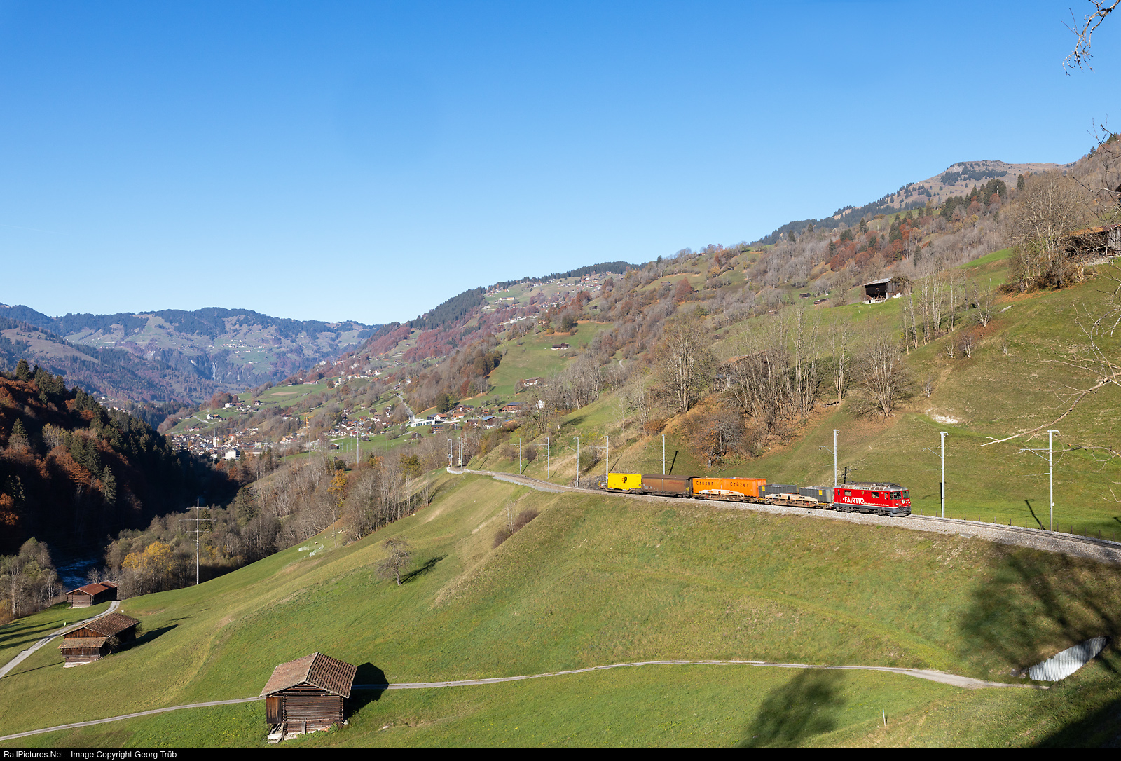 | Ge 4/4 II # 615 of the Rhaetian Railway, in the fairtiq publicity paint scheme, pulls the freight train 5225 from Chur freight yard via Landquart-Klosters to Scuol-Tarasp, between Küblis and Saas im Prättigau, on a grade of 3.5 %. |
