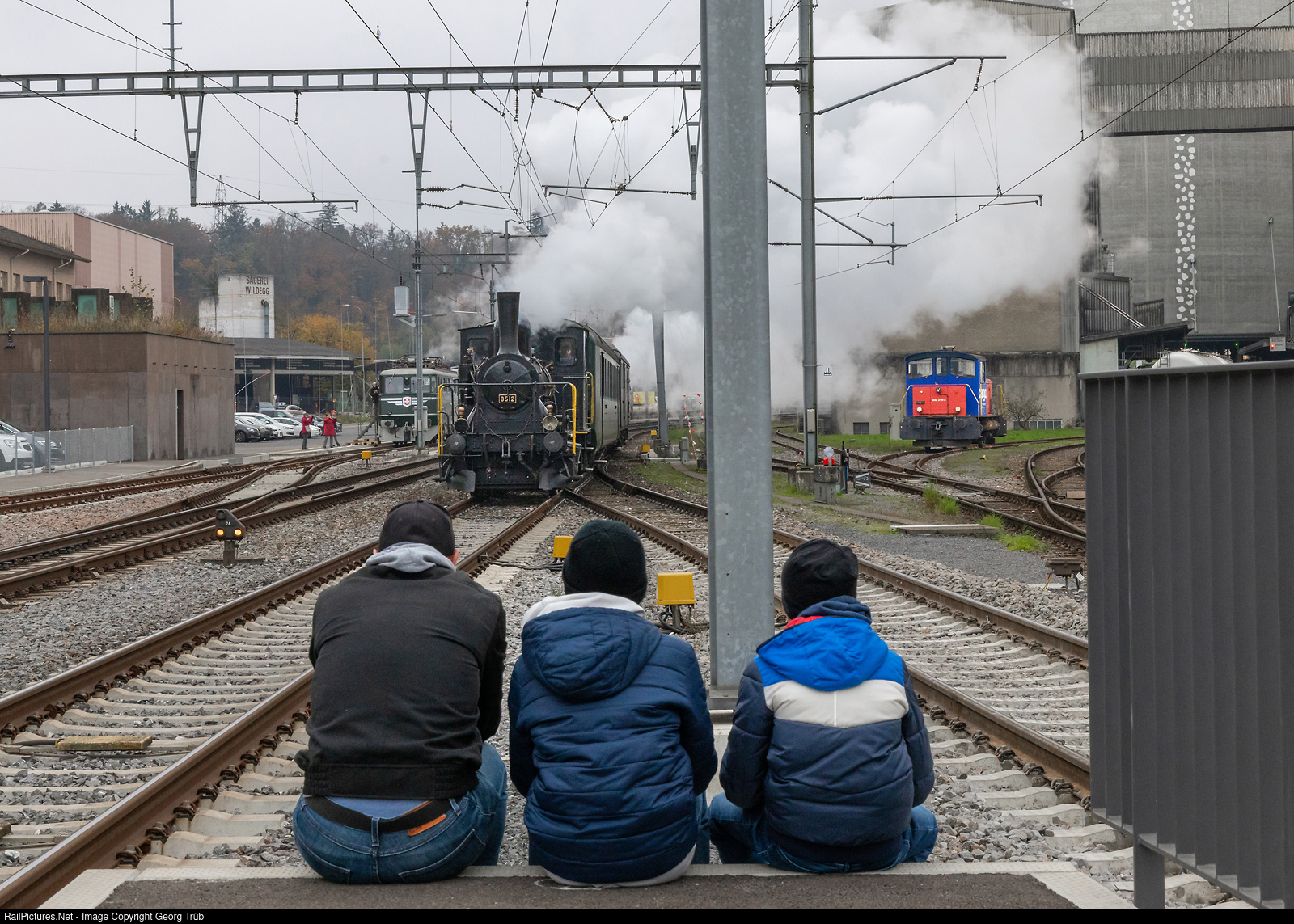 | On the occasion of the inauguration of the rebuilt Wildegg station area, steam trips were made to the extensive sidings of the station. The steamlocomotive E 3/3 # 8512 of the steam group Zürich is shunting with the short train from track 4 to track 2 for exit. On the left in the background the exhibited Gotthard locomotive Ae 6/6 # 11407 "Aargau". |