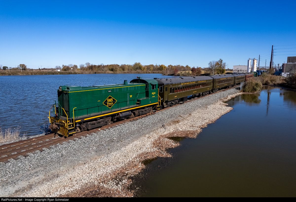 | SMS Rail Lines and the Woodstown Central Railroad hosted a photo charter weekend in celebration of the 50th anniversary of Railfan & Railroad Magazine. Here the train is seen on the causeway west of Mannington Mills. Baldwin S-12 was in charge for the run west, while GP38-3 2003 will lead back east. |