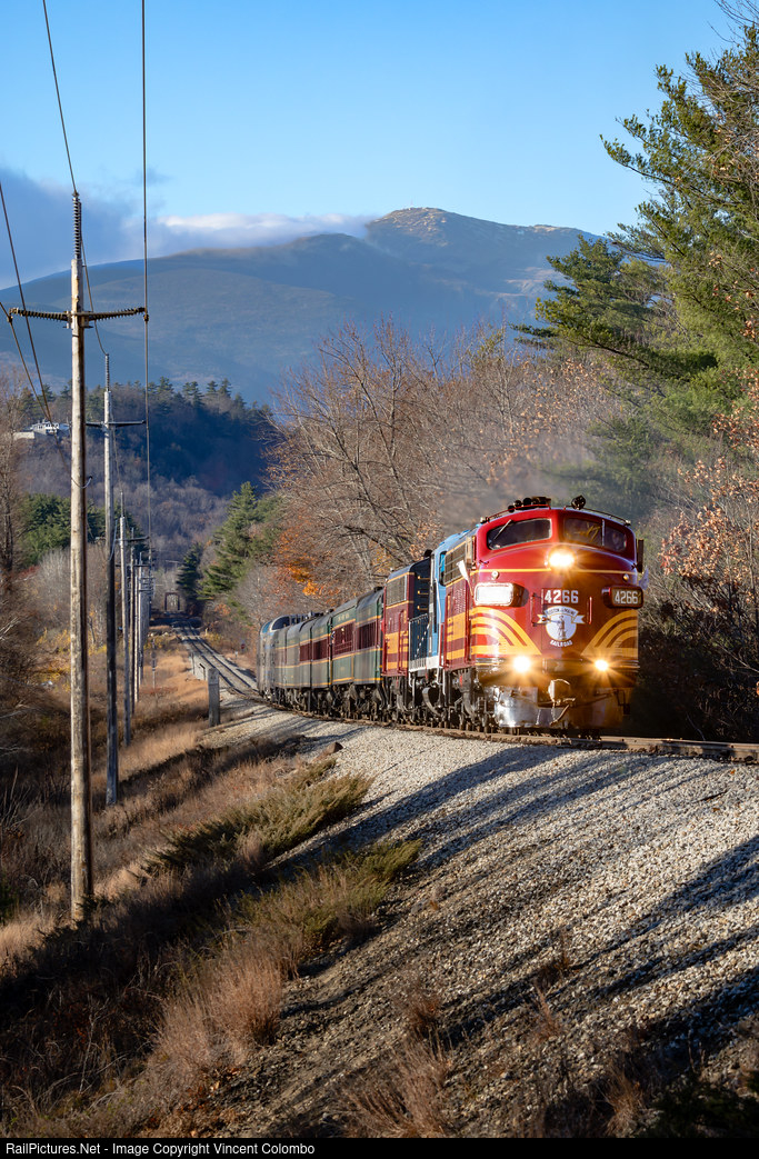 The annual 470 RR Club Excursion climbs the grade just shy of MP 62 in Intervale, NH. 4266, 1741, and 4268 are leading the train east back to North Conway. After a cloudy day in the notch, Mount Washington has made an appearance to end the day.