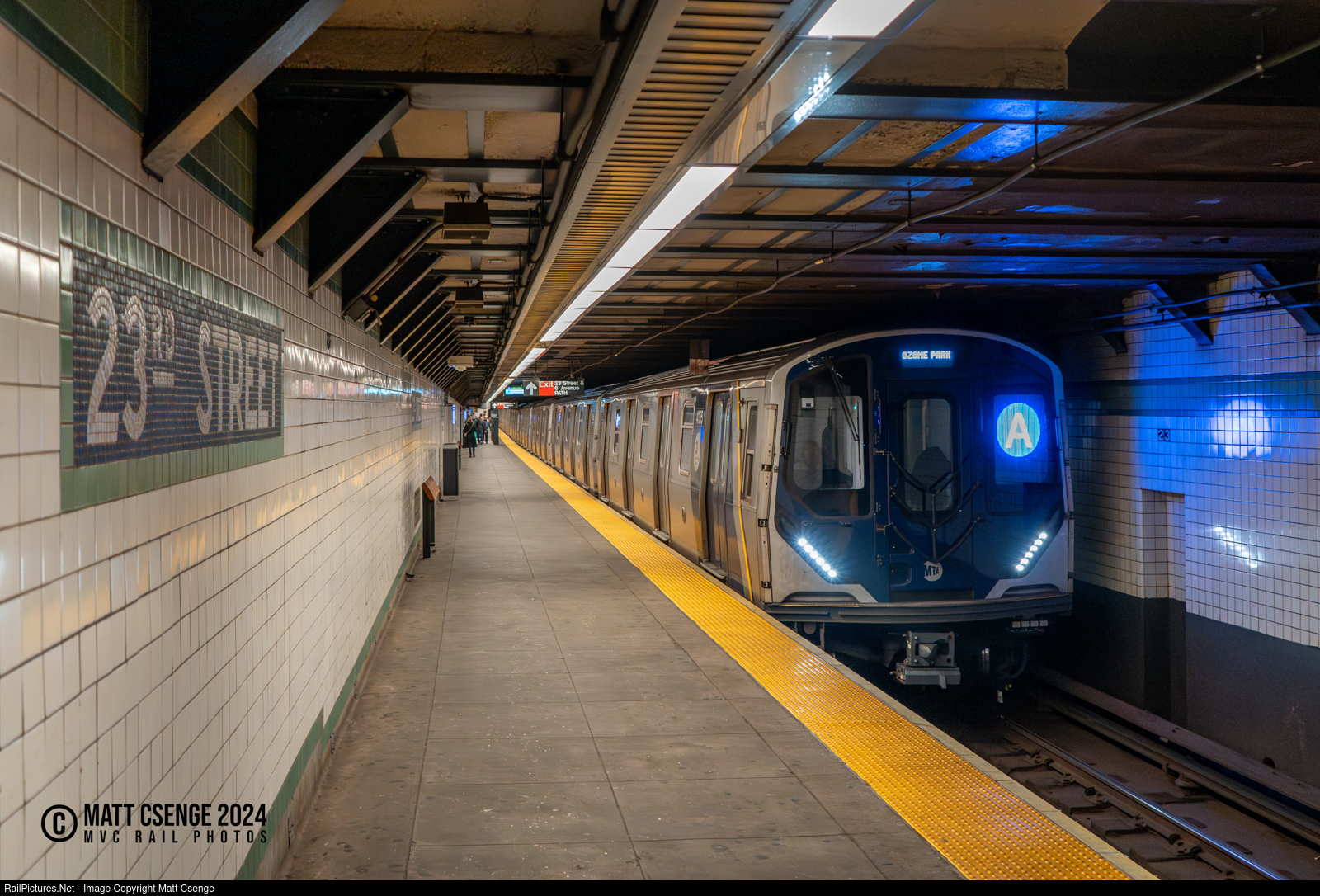 Columnless Cut and Cover. New York City Transit Authority (NYCTA) R211A car 4155 is the lead motor on a Brooklyn-bound A train seen arriving at 23rd Street Station on the IND 6th Avenue Line. On this weekend trains were running from Far Rockaway / Ozone Park to 96th St-2nd Ave due to switch replacement work at 59th Street, making for some interesting photo opportunities with the new cars on the 6th and 2nd Avenue Lines.