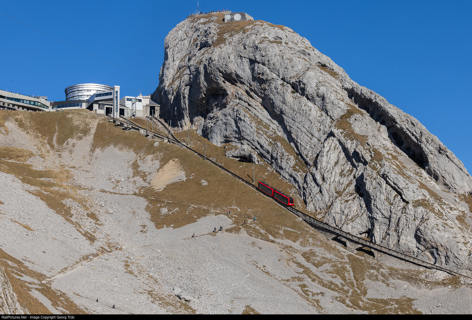 | This 2118 meter high peak of the Pilatus massif is called Esel (donkey). Two coupled Bhe 2/2 railcars of the Pilatus Railway descend the steep route as train 24 to Alpnachstad. The Pilatus Railway is the only one to use the Locher cogwheel system and, at up to 48%, is the steepest cogwheel railroad in the world. |