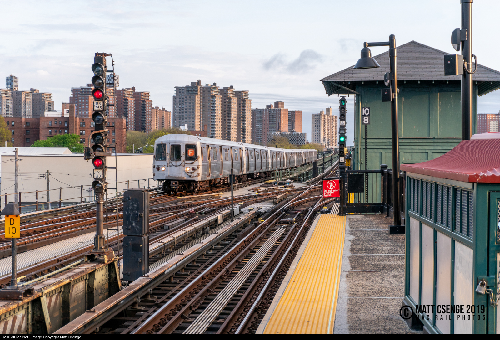 New York City Transit Authority (NYCTA) R46 car 5702 is the lead motor on a Manhattan-bound F train, seen passing the closed signal tower at Avenue X Station.