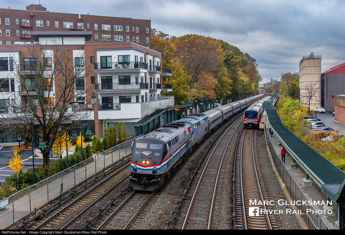 East River Tunnel Construction Effects. Amtrak Train 63 was passing through MTA Metro-North Ludlow Station in Yonkers, New York on the morning of Monday, November 11, 2024 with two locomotives and ten cars. The lengthy consist will now be the new standard on the Maple Leaf, combining it with the Adirondack (Train 69) between New York Penn Station/Moynihan Train Hall and Albany-Rensselaer, New York, to accommodate East River Tunnel Construction between Penn Station and Sunnsyide Yard, reportedly for up to three years. Reciprocally, The southbound train will return as Train 64 (Maple Leaf) combined with Train 68 (Adirondack). Two other Empire Service trains are also canceled in each direction, and other train times have been changes. There are changes on the Northeast Corridor as well, so check your train times. At the Albany-Rensselaer, New York station, the train will split with the Maple Leaf going to Toronto and the Adirondack going to Montreal. Keen observers will note another change in this pic - the Adirondack portion of this train is five AmFleet Is instead of the usual mostly AmFleet II consist.
