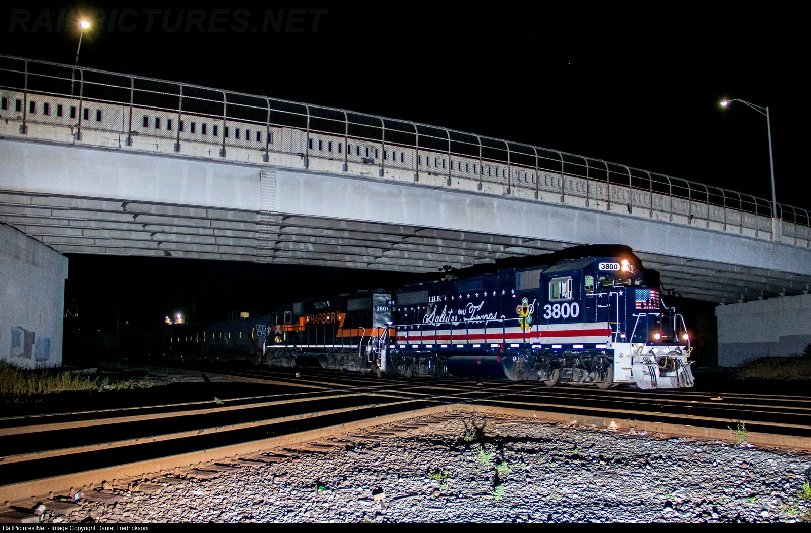 IHB 3800, the Indiana Harbor Belt's GP38-2 painted in a scheme to honor our veterans, trundles through downtown Hammond, IN with an eastbound IHB freight, seen here crossing the NS Chicago District.