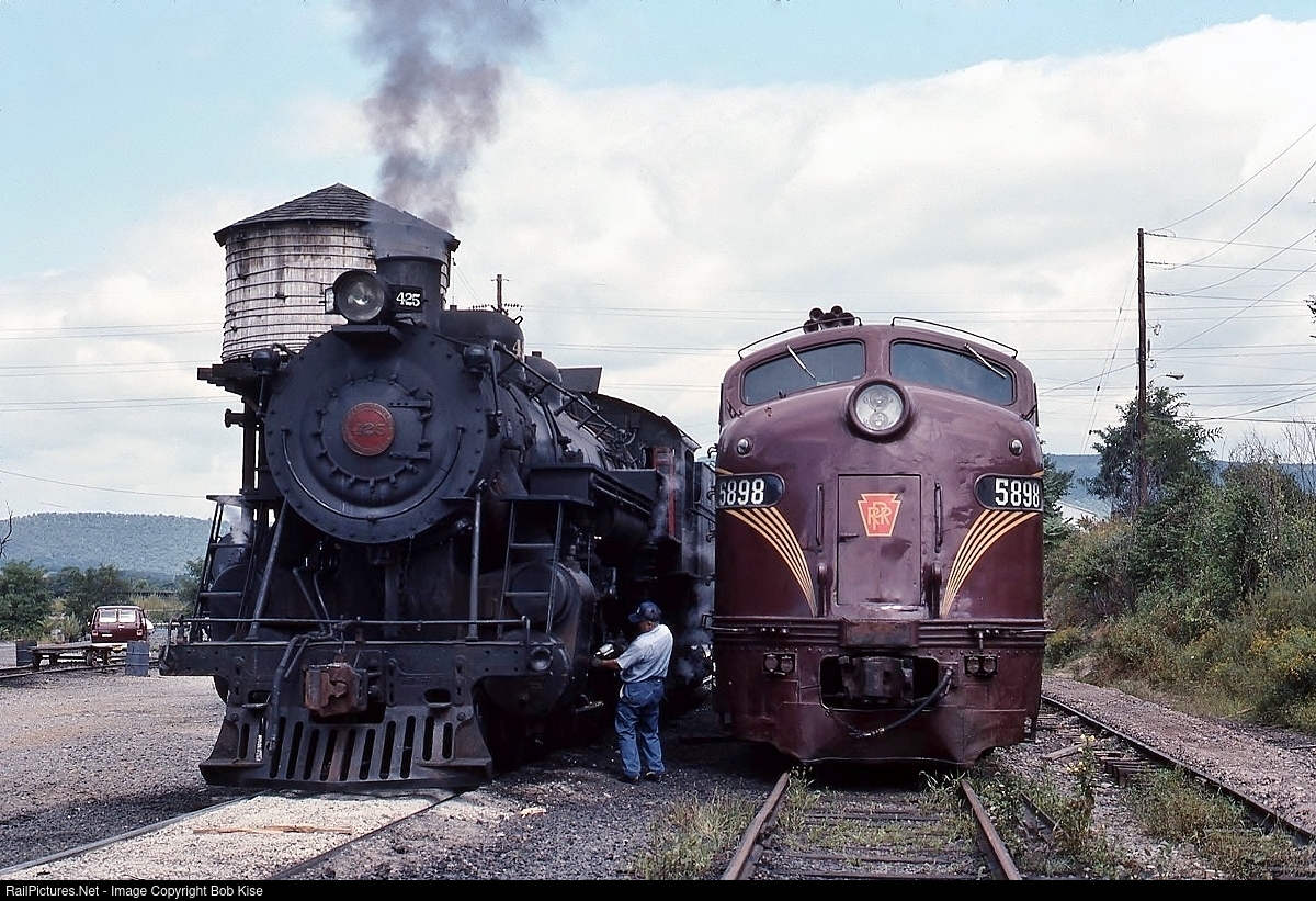 The engineer is oiling around the 425 down by the water tank in the old Blue Mountain & Reading's South Hamburg Yard. Pennsy E8A No. 5898, classified as an EP-22* by PRR, was built by EMD in 1951 and rated at 2,250 horsepower. (*EMD, Passenger, 22 hundred horsepower.)