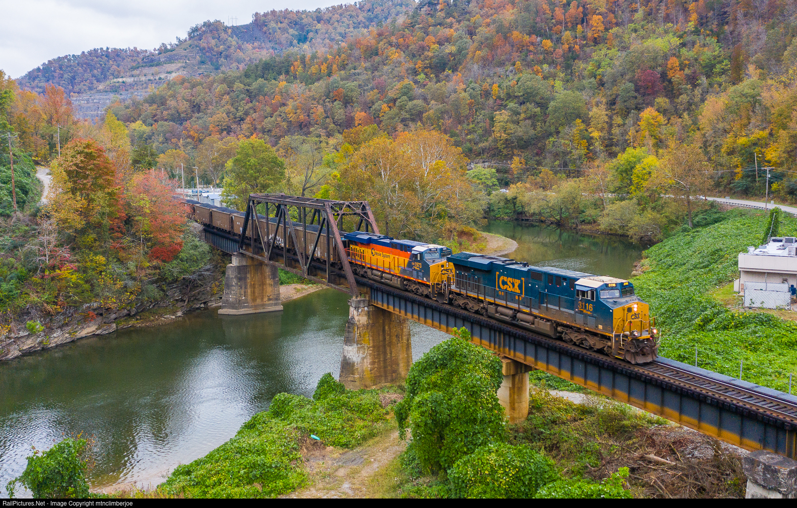 After holding to meet the northbound M692, loaded CSX coal train C313 is on the move south on the Big Sandy Subdivision as it crosses the bridge over the Russell Fork River in Elkhorn City, Kentucky. Just past this location, the former C&O rails become the former Clinchfield, which is now the Kingsport Subdivision.