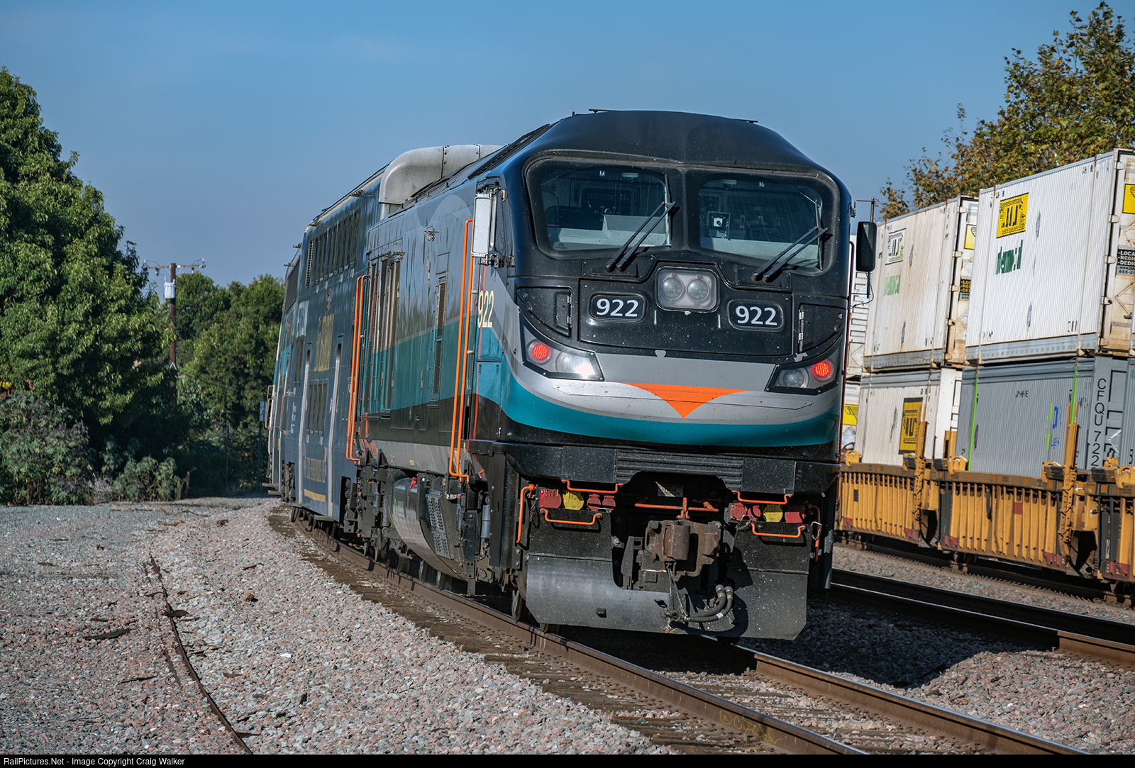 As a BNSF intermodal train led by ES44DC 7474 hustles eastbound on Track 1, Metrolink 91/Perris Valley Line train 707 departs the station in Buena Park, heading form Perris to Los Angeles. SCAX cab car 639 leads this train, with F125 922 shoving on the rear. Just ahead of the locomotive is Metrolink coach 282, wearing a blue wrap advocating for rail safety when the public is near railroad tracks. (Buena Park, California - November 11, 2024)