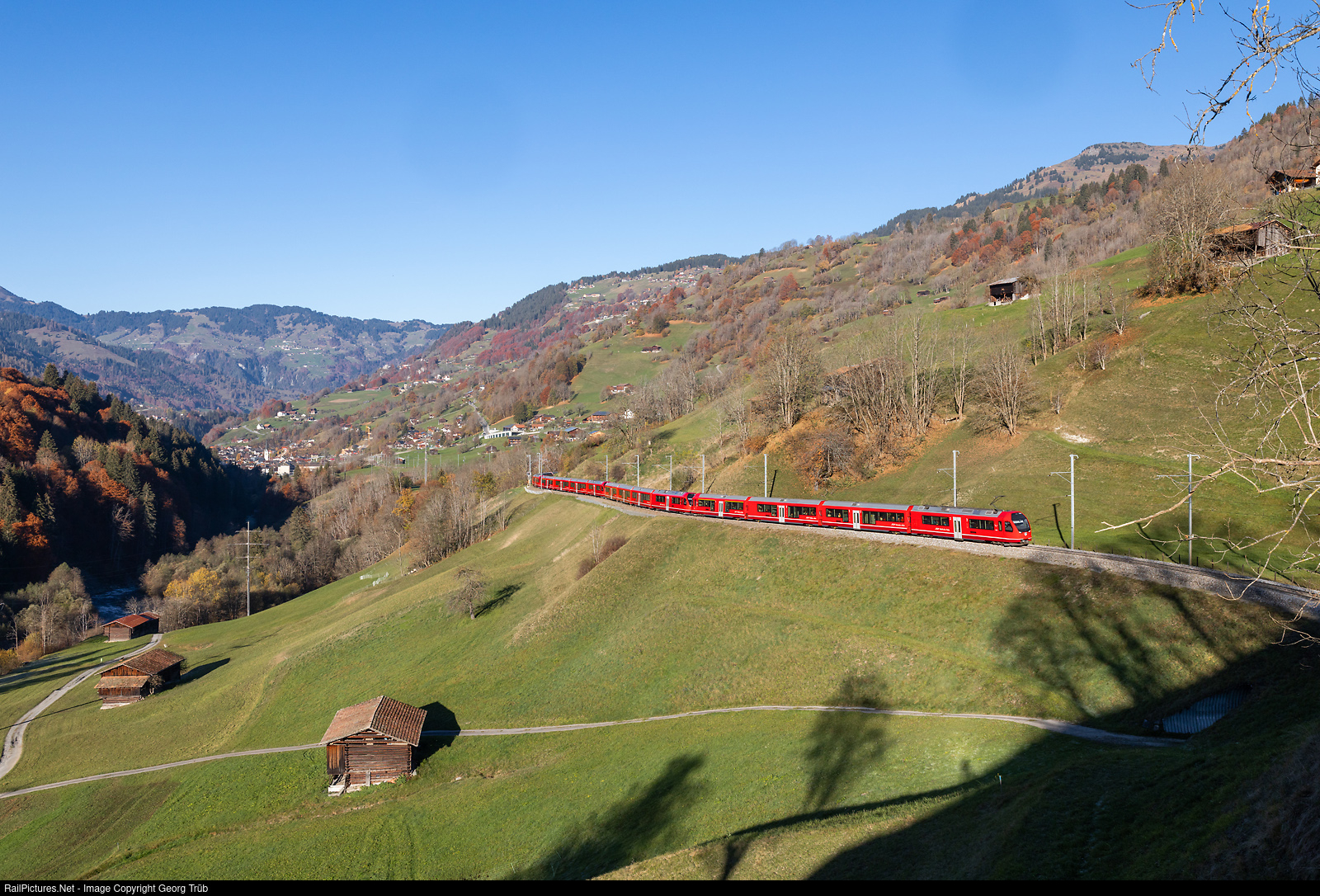 Between Landquart and Klosters Platz and vice versa, the Rhaetian Railway operates trains up to 300 meters long, consisting of 4 coupled “Capricorn” trains in multiple control. In Klosters Platz, the trains are split (joined in the opposite direction) to continue to Scuol-Tarasp, St. Moritz or Davos Platz. ABe 4/16 "Capricorns" # 3120, # 3124, # 3148 and # 3127 in multiple control are running the RE 7025 of the line RE24 from Landquart to Klosters Platz between Küblis and Saas im Prättigau. From Klosters Platz the two first trains will run to Scuol-Tarasp as RE 7225, the last two trains as RE 1825 to Davos Platz.