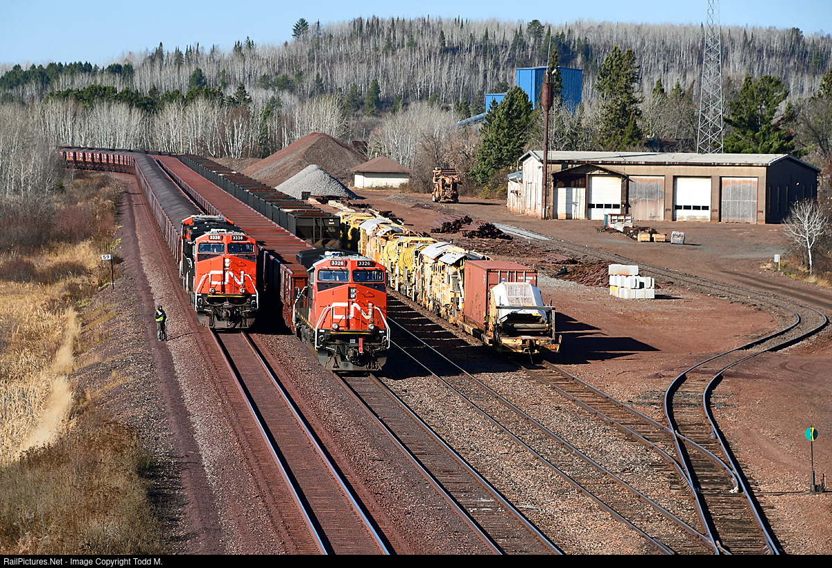 | A southbound pellet train loaded from Minntac's west pocket meets an empty pellet train heading to Minntac's east pocket to load. The sb has the two engines up front while the nb had a 1x1 setup with both trains having 145 cars. |