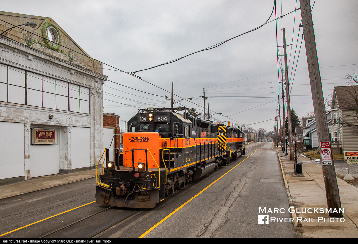 Once Upon A Time On 11th Street. Under a dark sky, Chicago South Shore & South Bend Railroad (South Shore Freight) SD38-2s CSS 804 (ex-IAIS 154, exx-LLPX 2803, née-Reserve Mining 1239) and CSS 805 (ex-IAIS 155, exx-LLPX 2804, née Reserve Mining 1230) were rolling down 11th Street in Michigan City, Indiana on the frigid morning of February 18, 2020. Passenger service here was suspended on May 1, 2021 as the scene was completely changed to operate over a newly constructed separated double-track line. While the Insull era South Shore building was demolished in February, 2022, the historic terra cotta facade has been reportedly preserved to be included in a mixed purposed development to include commercial and residential space at this site. On October 25, 2023, NICTD resumed passenger service in Michigan City, Indiana.