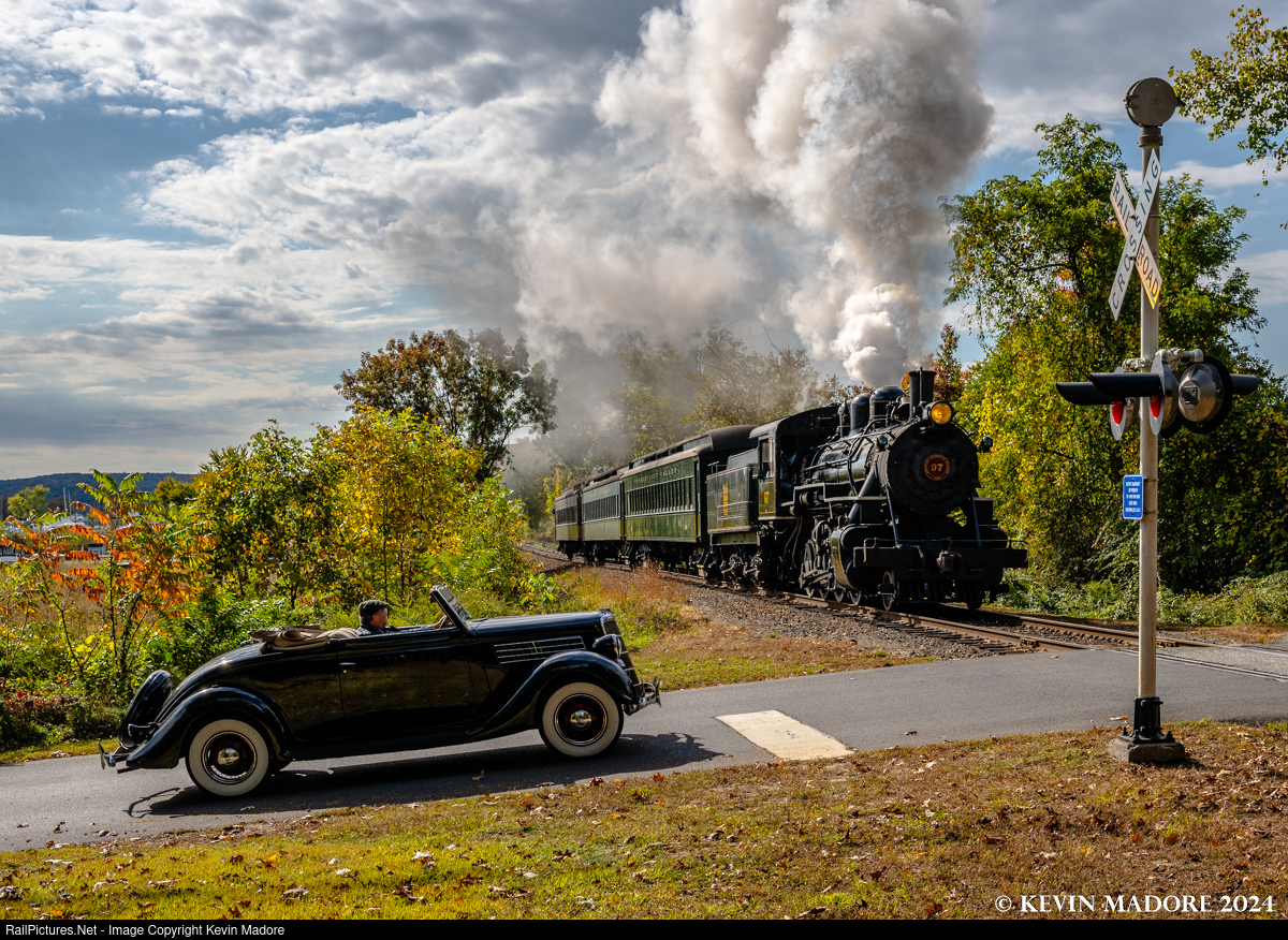 Classics meet at Dock Road. There's just a little fall color beginning to show along the Connecticut River Valley as a pair of classics from the early years of the last century meet at Dock Road in Chester, CT. On the left is a nicely restored, late 1930s Ford Cabriolet and, on the right, it's the former Birmingham & Southeastern Locomotive #200, a 1923, superheated, Alco 2-8-0, which since 1970, has been known as The Valley Railroad's old #97. She's seen here taking 3 steel coaches northbound as part of an October 2024 photo shoot organized by Dak Dillon Photography and operated by the Valley Railroad Company of Essex, CT.