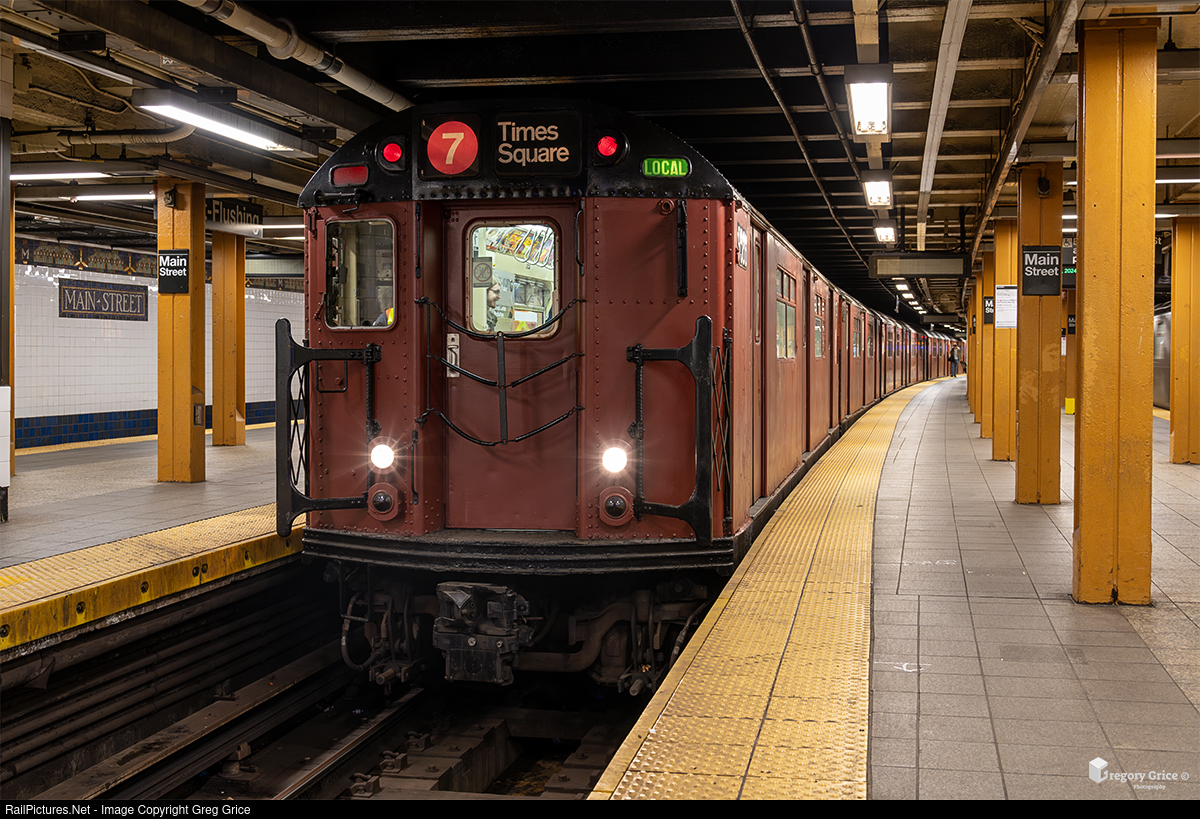 On the morning of November 9th, 2024, MTA New York City Transit St. Louis Car Company R36WF #9685 leads a 6-car train of Redbirds out of Flushing-Main Street station on the Flushing Line in Queens, New York. These classic A-Division (number) Line railcars, which were retired 21 years ago, were being transferred from Coney Island Yard in Brooklyn to the Flushing Line ('7' Train) in Queens via B-Division (letter) Lines for a movie shoot.