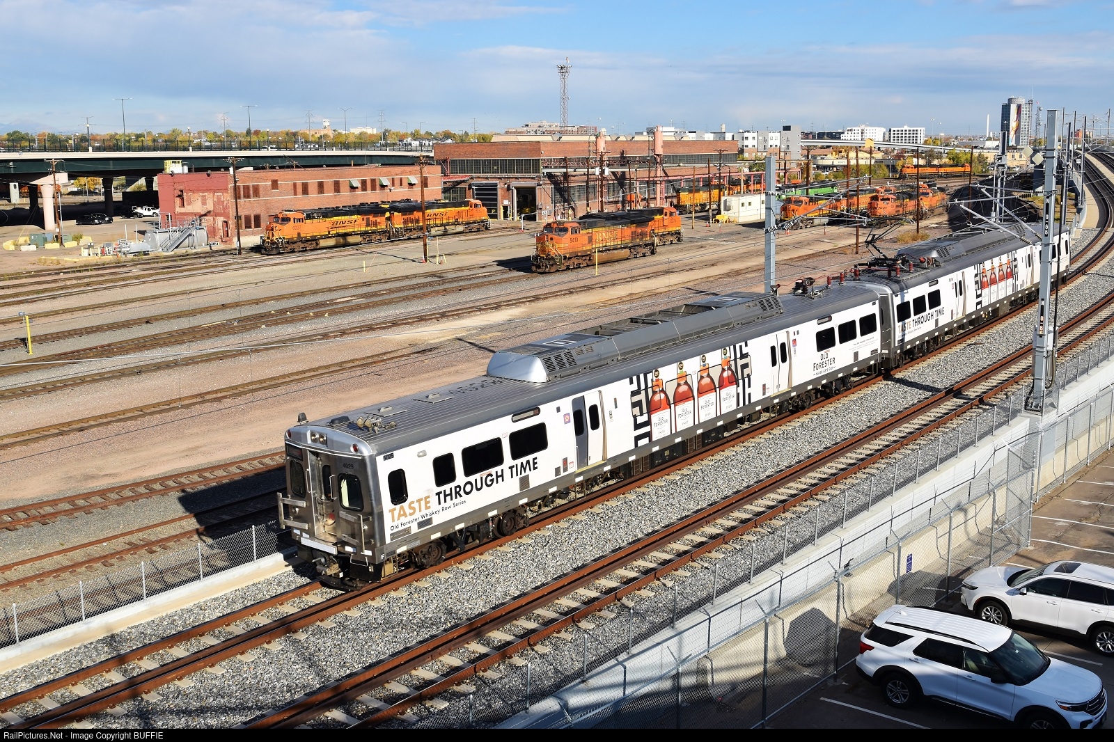| RTD commuter train #4029 (Hyundai Eagle P3) drops down from the elevated track spanning the yard of the BSNF engine servicing facility in Denver, Colorado.