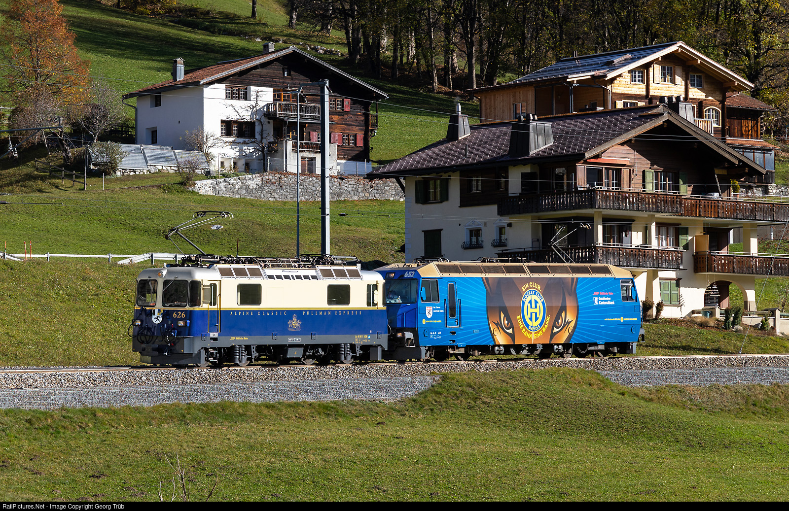 Ge 4/4 II # 626 of the Rhaetian Railway in the cobalt blue/ivory Pullman paint scheme and Ge 4/4 III # 652 in the Hockey-Club Davos paint scheme, are running as train 9024 from Davos Platz to Landquart, between Klosters Dorf and Serneus.