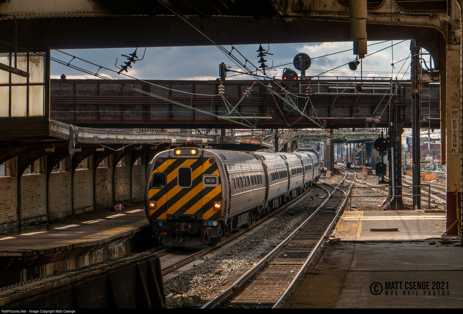 A New York-bound Amtrak Keystone Service train arrives at Newark Penn Station. The lead car is a cab car converted from a former Penn Central Metroliner EMU and it is bounded in nearly all sides by abandoned infrastructure, including the abandoned platform extensions of the Pennsylvania Railroad station and the abandoned bridge overhead, once part of the Central Railroad of New Jersey's line between Newark and Communipaw. |