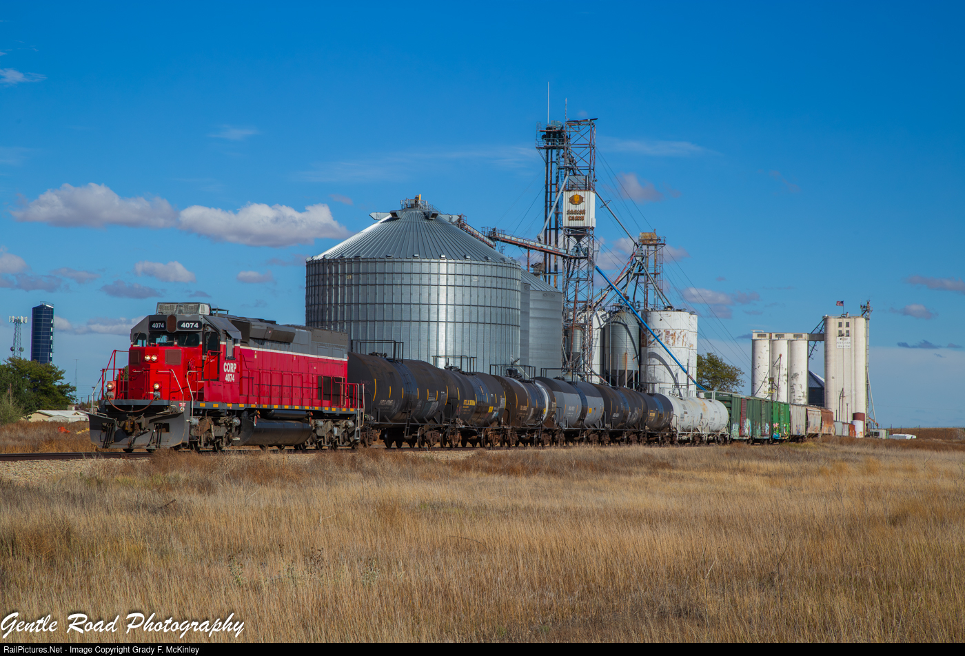 Central Oregon & Pacific #4074 leads the westbound KYLE train passing the grain facility at Arriba, CO.