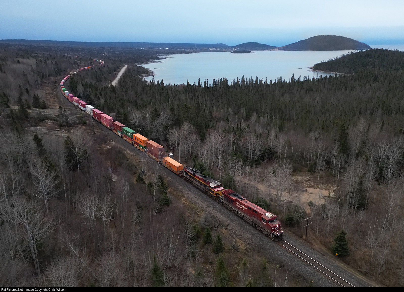 | November this year has been nothing far from dark clouds and relentless winds off Lake Superior. The wind finally let loose three miles west of Marathon at Carden Cove as Montreal to Vancouver train 113 heads west on a calm morning. One of the first of the original Canadian Pacific ES44AC's teams up with a Kansas City Southern SD70ACe and a UP ES44AC mid train with 9211ft of intermodal |