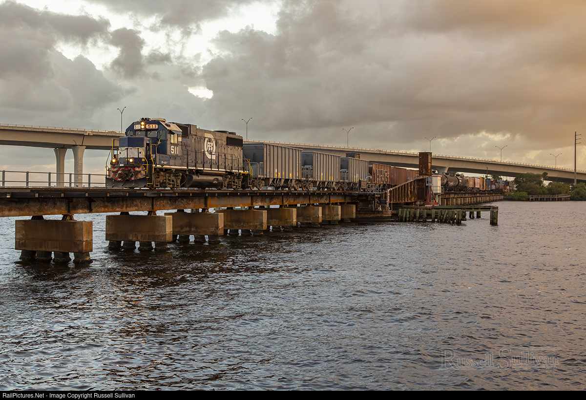 Florida East Coast 950, a turn from West Palm Beach to Fort Pierce, crosses the St. Lucie River Bridge in Stuart with GP38-2 511 leading. The 511 is one of three locomotives on the FEC roster still possessing the "Going Places" logo.