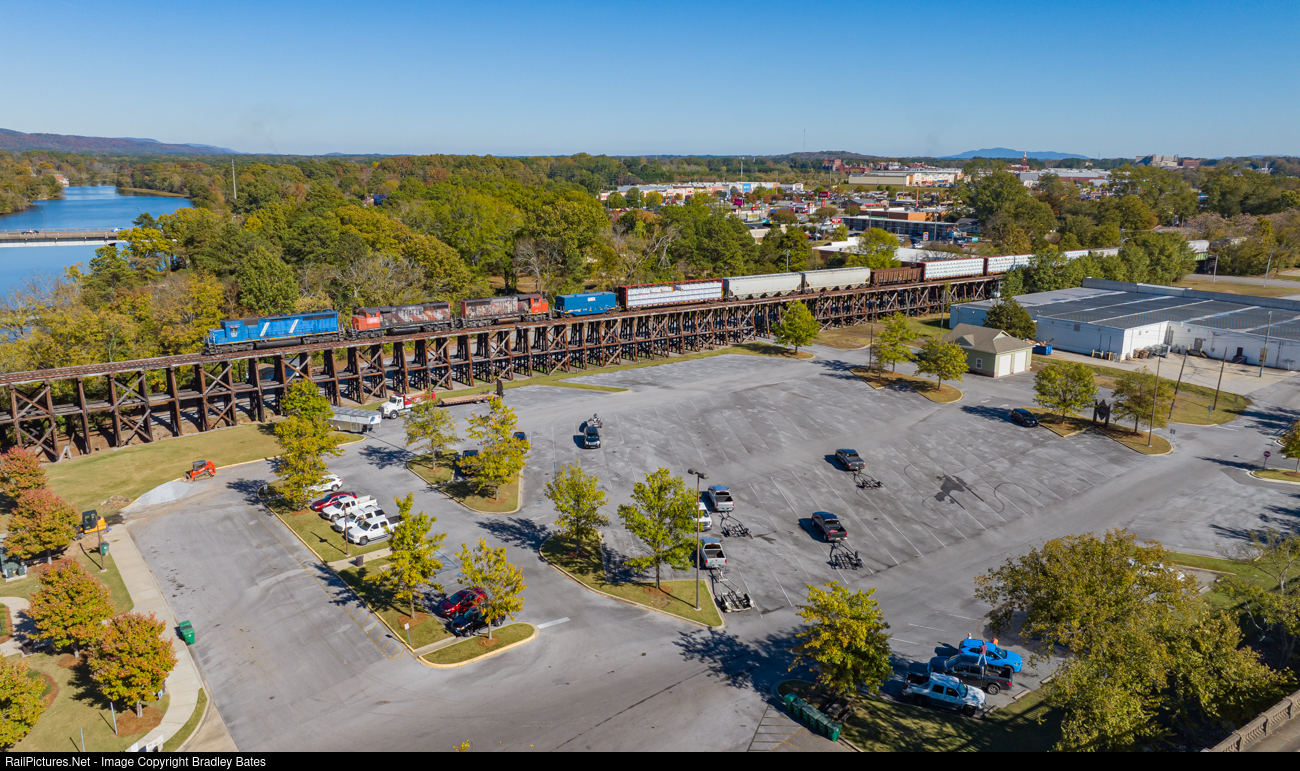Alabama & Tennessee River Railway Train Y102 heads north into Gadsden, AL. as they prepare to cross over the Coosa River.