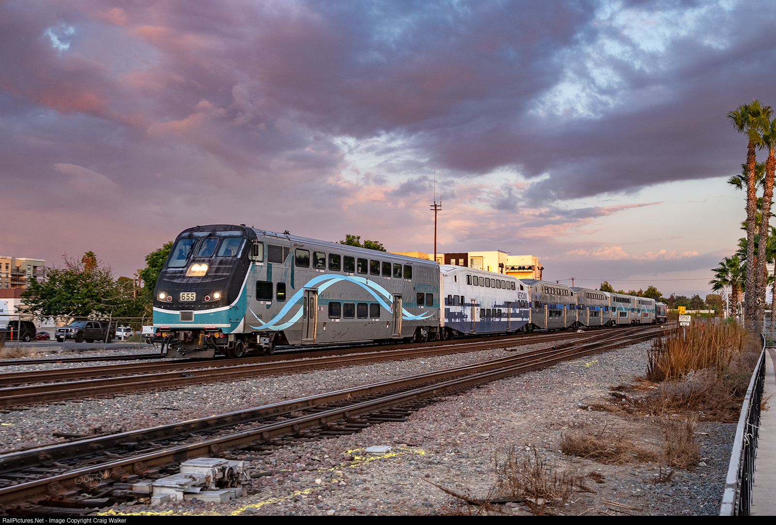 Metrolink train 623 crosses from Track 2 to Track 1 as it threads its way through Fullerton Junction and approaches its next stop - the Fullerton Transportation Center – on its journey from Oceanside to Los Angeles. Cab car 655 leads the train, built by Hyundai-Rotem in Korea, as F125 932 provides the muscle at the rear of the 6-car train, which includes three different paint schemes. (Fullerton, California – November 15, 2024)