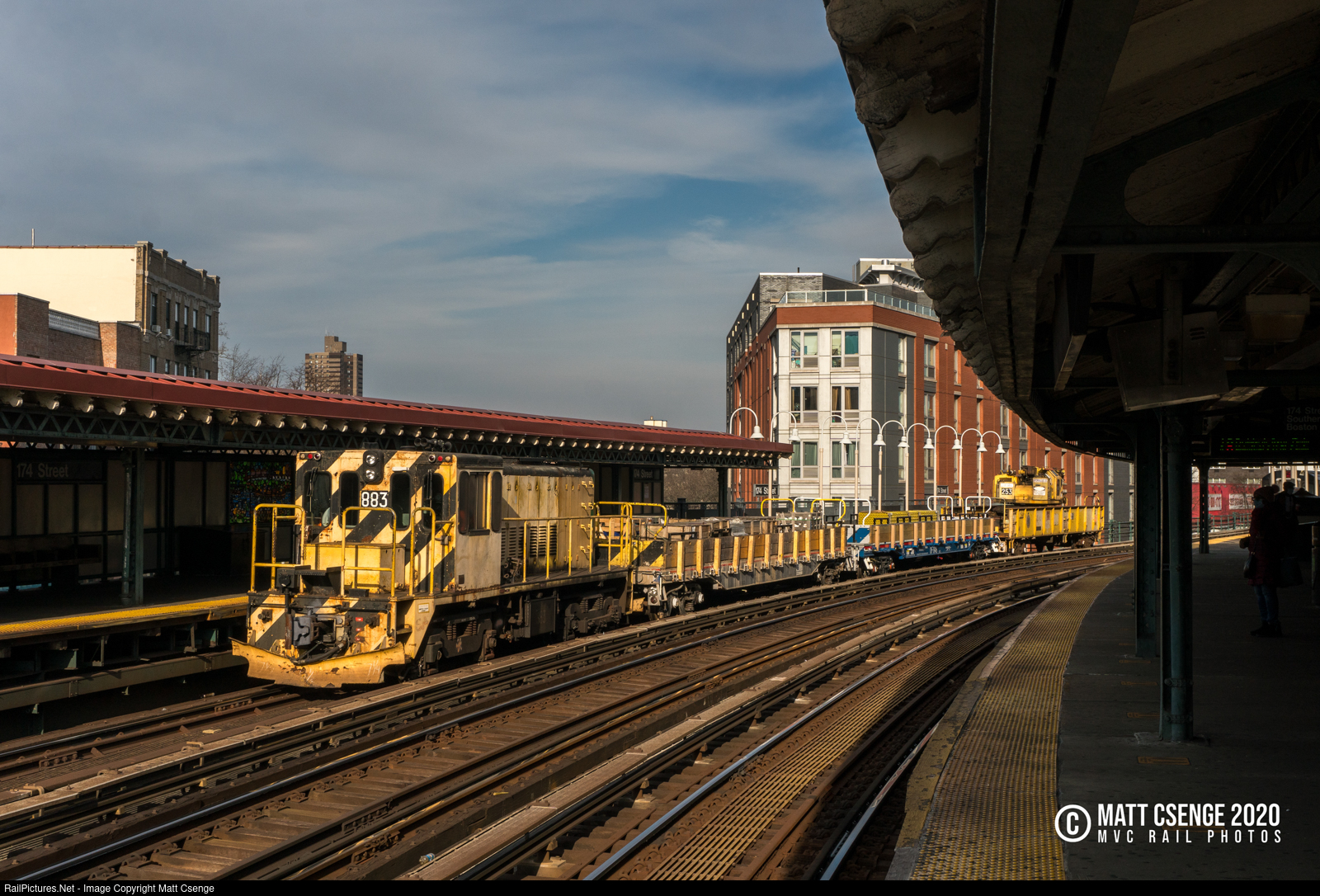 A New York City Transit Authority (NYCTA) C-Division work train sits at 174th Street Station on the IRT White Plains Road Line, awaiting maintenance forces to arrive. This setup is one of the most common types of work trains in the system: a locomotive, two flat cars carrying materials, and a crane car. The power for the train is R77 locomotive 883 (GE model SL50, 1983), accompanied by R141 flat car 614 (AMF Technotransport, 1997), R252 flat car OF848 (Harsco Rail, 2019-2021), and R53 crane car 253 (Fuji Heavy Industries, 1979).