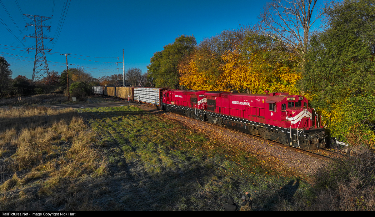 | Minnesota Commercial B23-7 44 and B30-7 49 take control of the morning's Hugo Job as they make their way through the city of Little Canada. Some fall color is still hanging on in the area. 44 was built as the ATSF 6370 in 1979 and 49 was built as the CO 8293 in 1981. |