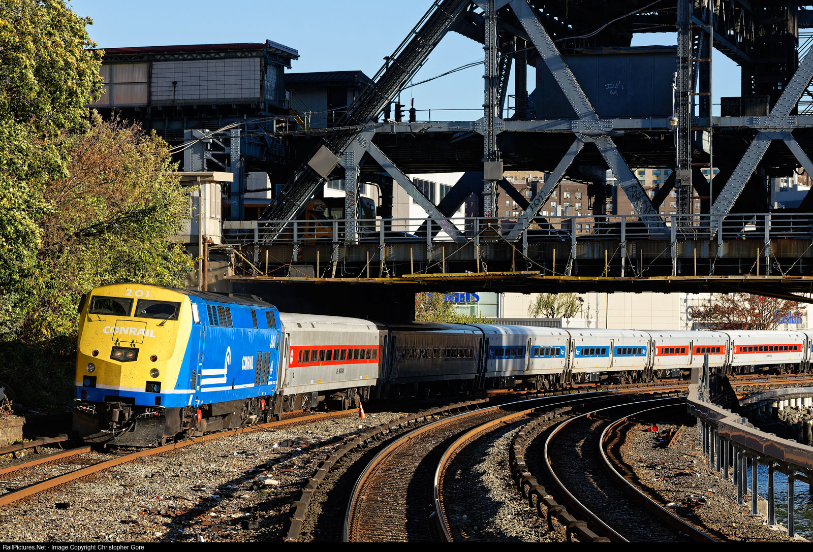 Conrail heritage P32AC-DM 201 passing under the Broadway Bridge in the Marble Hill section of Manhattan.