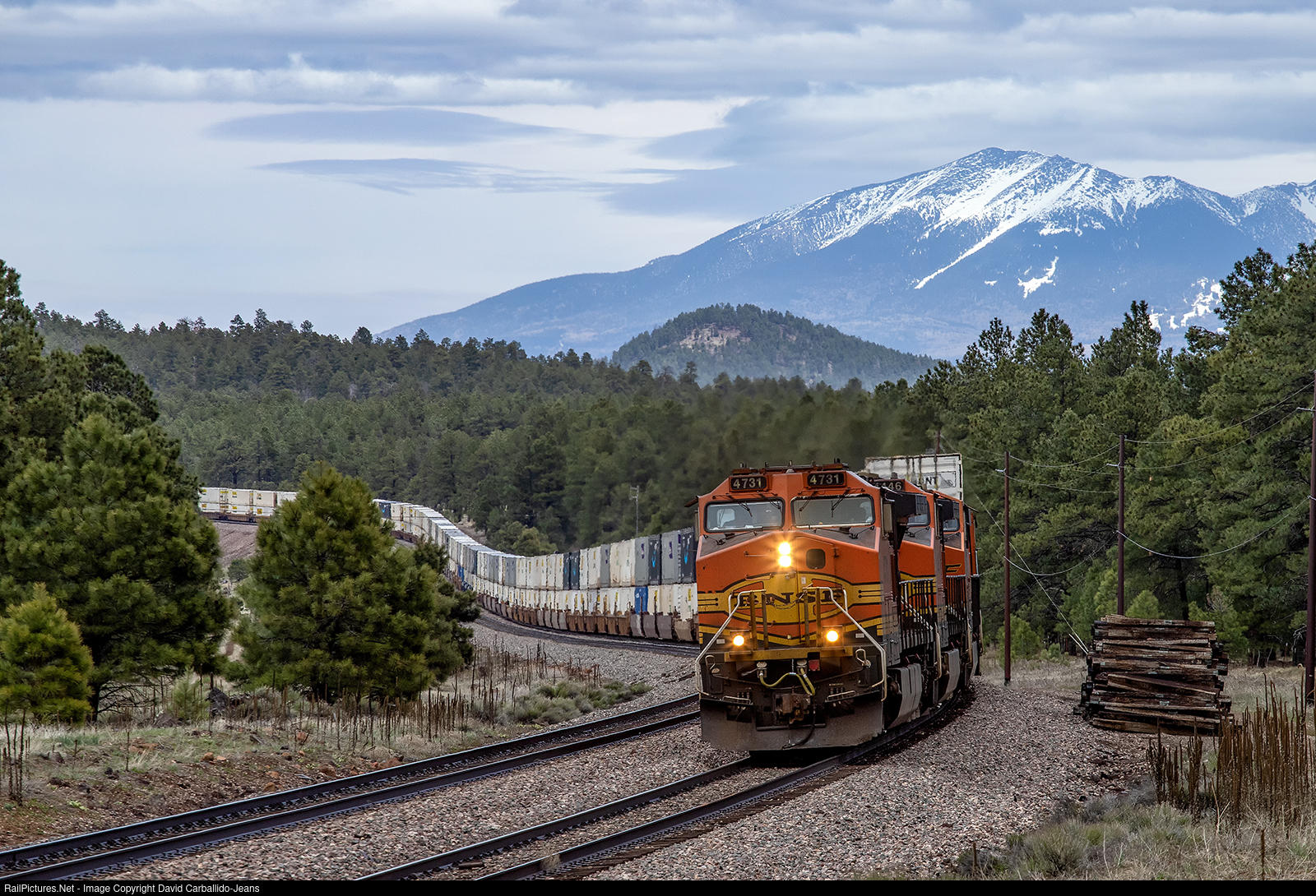 | An early May storm has left snow over the San Francisco Peaks as a westbound Z-train traverses over the tricky hogbacks of Bootlegger near Williams, AZ. |