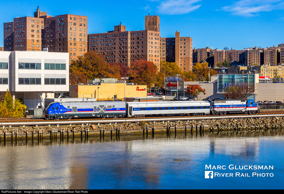 Headed To The Wye. On Friday, November 15, 2024, MTA Metro-North Railroad's first Siemens SC42-DM, MNCW 301, was brought to Mott Haven with MN 1 to be turned. This dual mode locomotive is one of 33 on order to start to replace the railroad's General Electric P32s. Though similar to the all diesel design of the SC-44 and ALC-42, these locomotives also had to go to the testing center in Pueblo, Colorado for full evaluation before delivery to Metro-North. The SC42s are being prepared for testing prior to entering passenger service. The short consist is seen passing through the Marble Hill section of New York, New York on the Harlem River.