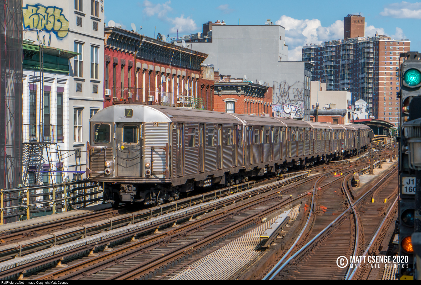 New York City Transit Authority (NYCTA) R32 "Brightliner" car 3669 is the lead unit on a Manhattan-bound Z train seen approaching Marcy Avenue Station on the BMT Jamaica Line. These cars were built by Budd from 1964-1965, and had recently returned to revenue service after mechanical issues sidelined the then-new R179 fleet. |