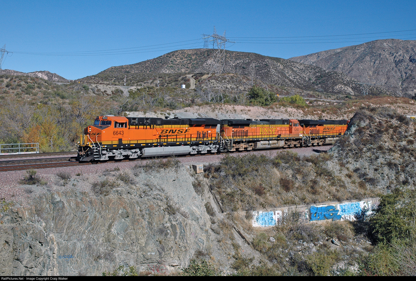 This baretable train (or, in other words, a train of empty intermodal cars) originated in Phoenix, Arizona, and it bound for Los Angeles CA. BNSF ES44C4 6643, Dash 9-44CW 5260 and ES44DC 7212 are bringing their train through Blue Cut, in the lower reaches of Cajon Pass, on a sunny November morning. (Cajon Pass, California – November 13, 2010)