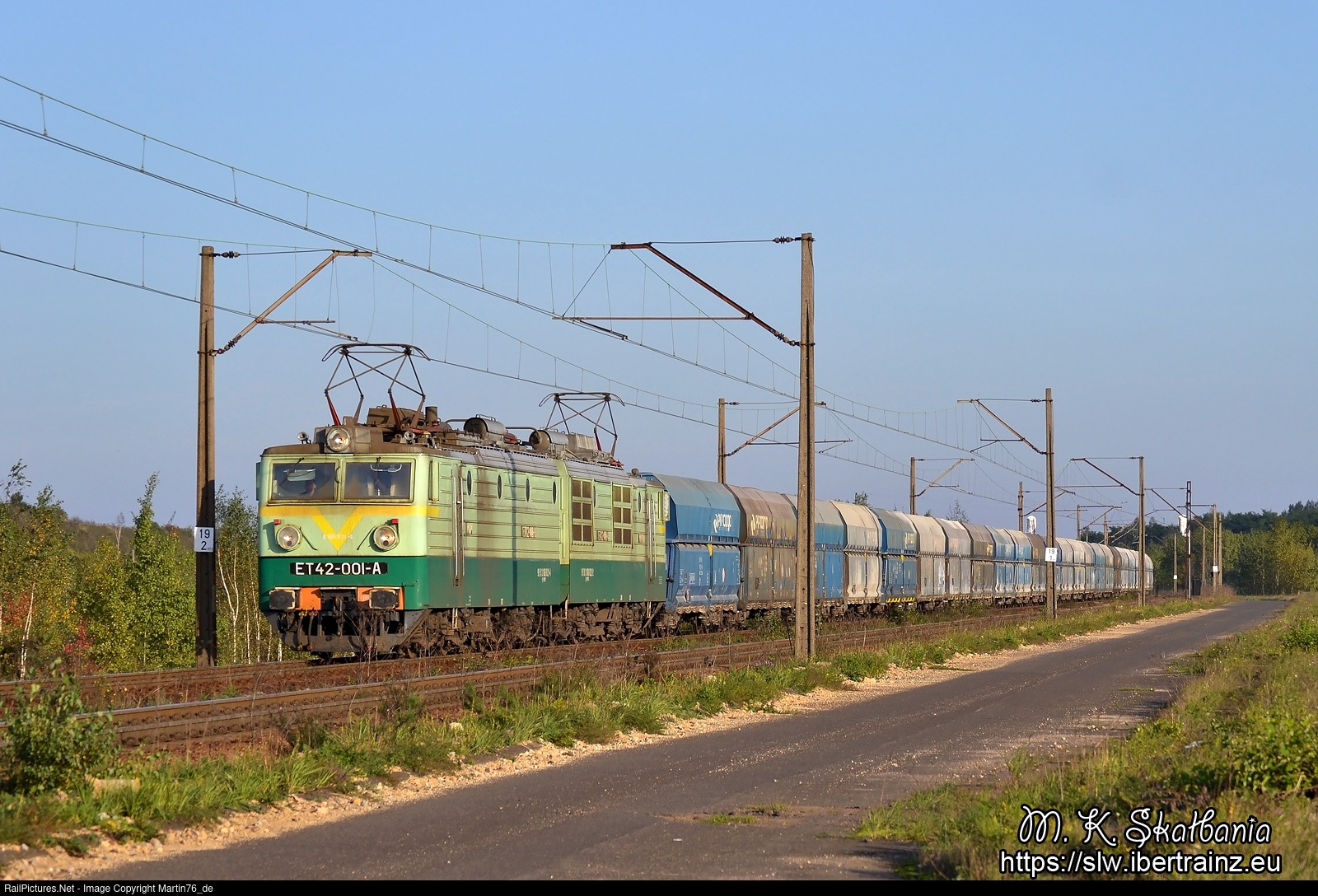 | The two section electric locomotive ET42-001 hauling a freight train from Chorula Cementownia to Dabrowa Gornicza Towarowa and enters the destination station.