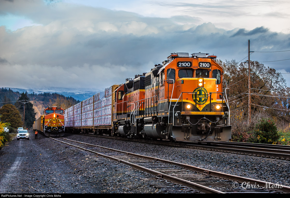 | Westbound GP38-2 no. 2100, Highballs past a gravel train waiting in the siding in Washougal WA for a lumber train to pass along Evergreen Way.