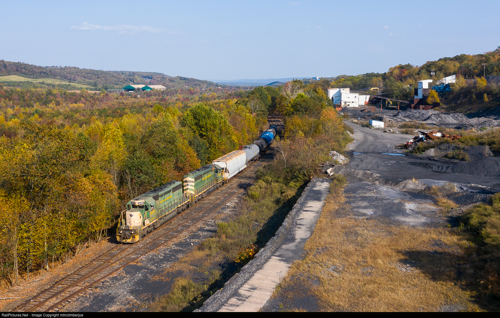 | Climbing out of the valley and nearing their destination, the Reading & Northern's WCGS passes by an old coal loadout outside of Good Spring, Pennsylvania behind a pair of SD40-2's. The local has 5 loads of propane in tow bound for the Koppy's Propane terminal at the end of the line just outside of town. |