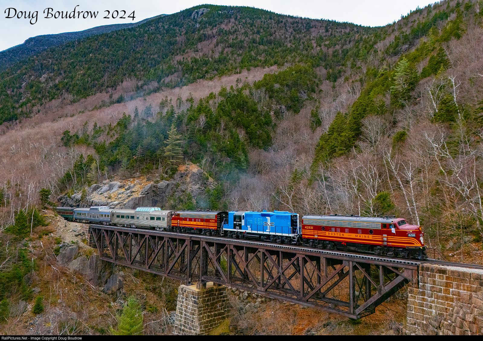 | The 470 Club ran their annual excursion today in conjunction with Conway Scenic Railroad. The trip to Fabyan included all three of the club's restored Boston & Maine diesels including the recently finished GP9 1741. The train is seen crossing Willey Brook Bridge and approaching Crawford Station. |