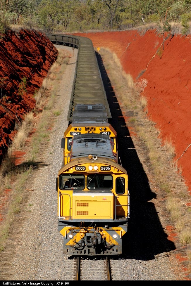 Mt.Isa-bound empty copper concentrate train 9M58 heads west through the Red Cutting near Pentland behind 2605 and 4021. The off-set cab windows on 2605 are designed to enable driver-only operation.