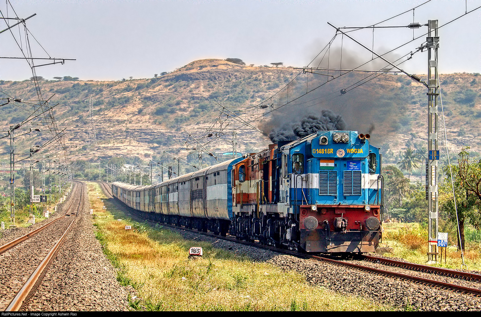 | The WDG3a (derated) twins from Pune headed by #014818 throttles up to clear the up gradient near Fursungi with NMG rake. Ramdara, Dated 18 Nov 2024. |