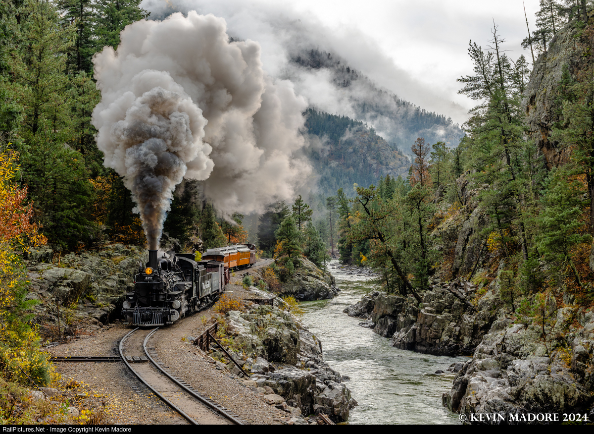 This image was captured during an October 2024 photo shoot on Colorado's Durango & Silverton Narrow Gauge Railroad, organized by Trains Magazine. The event featured K-28 Locomotive #473, lettered as her long-lost sister, #477, which was acquired by the US Army during World War II for service on the White Pass & Yukon, and sadly did not survive her hard, Alaskan service. Our Silverton mixed is pictured here approaching the water stop at Tank Creek, at around Milepost 474.6.